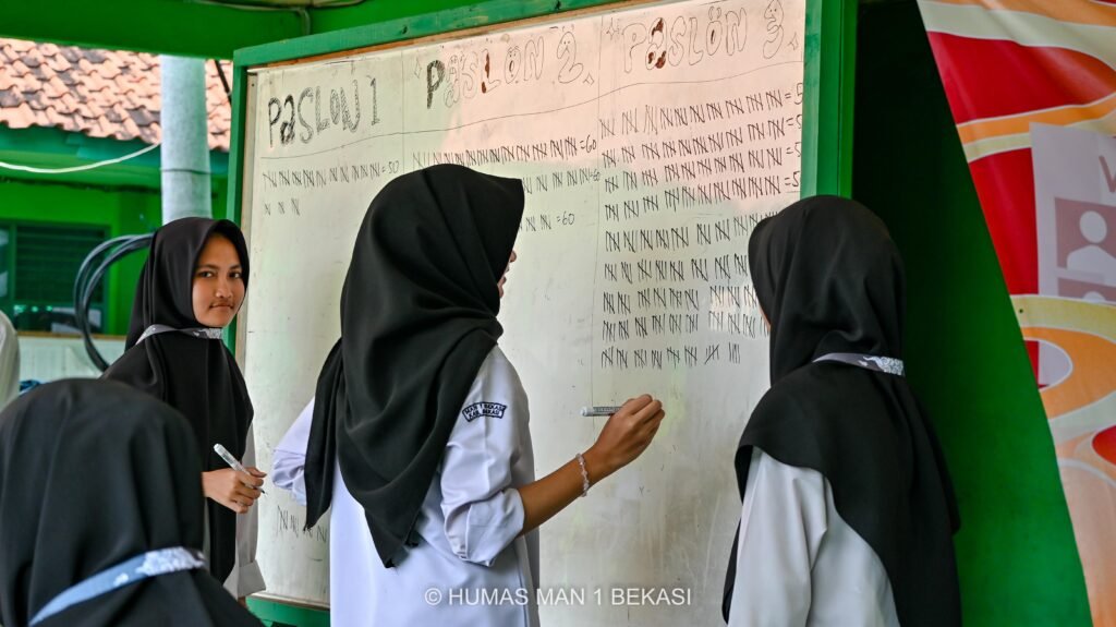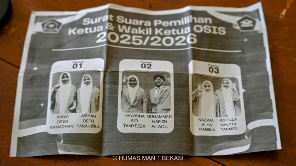 Cikarang Utara – MAN 1 Bekasi sukses menggelar pesta demokrasi pemilihan Ketua dan Wakil Ketua OSIS periode 2025/2026 pada hari Rabu tanggal 24 September 2025. Bertempat di Pangkreas, seluruh siswa berpartisipasi aktif menyalurkan hak pilihnya untuk menentukan kepemimpinan baru OSIS.