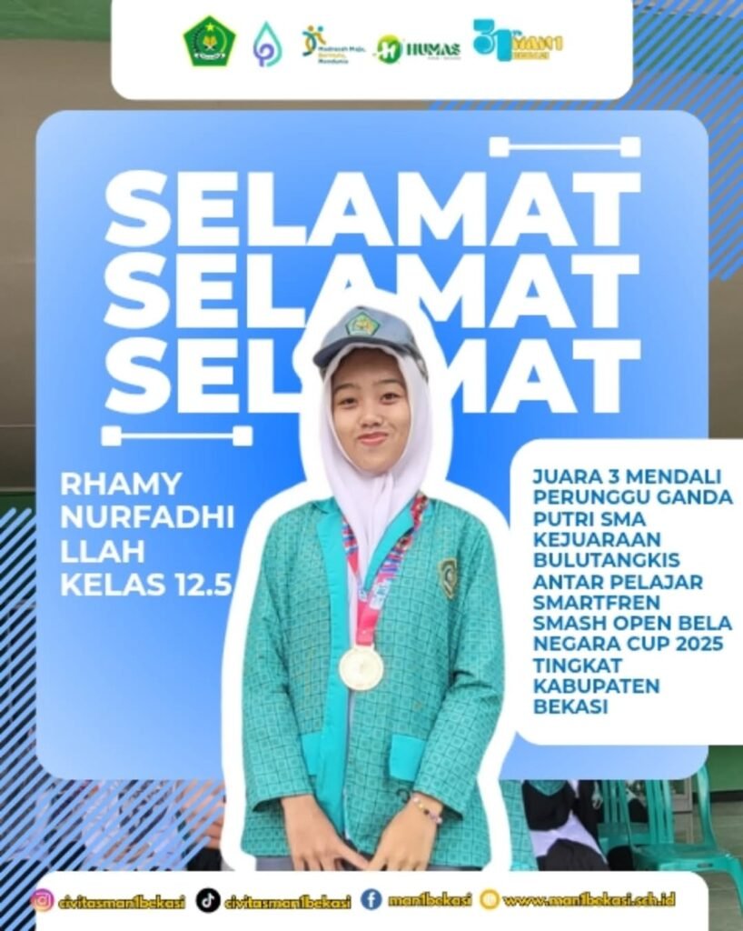 1. Rhamy Nurfadhillah 12.5 Juara 3 mendali perunggu ganda Putri SMA KEJUARAAN BULUTANGKIS ANTAR PELAJAR SMARTFREN SMASH OPEN BELA NEGARA CUP 2025 TINGKAT KABUPATEN BEKASI