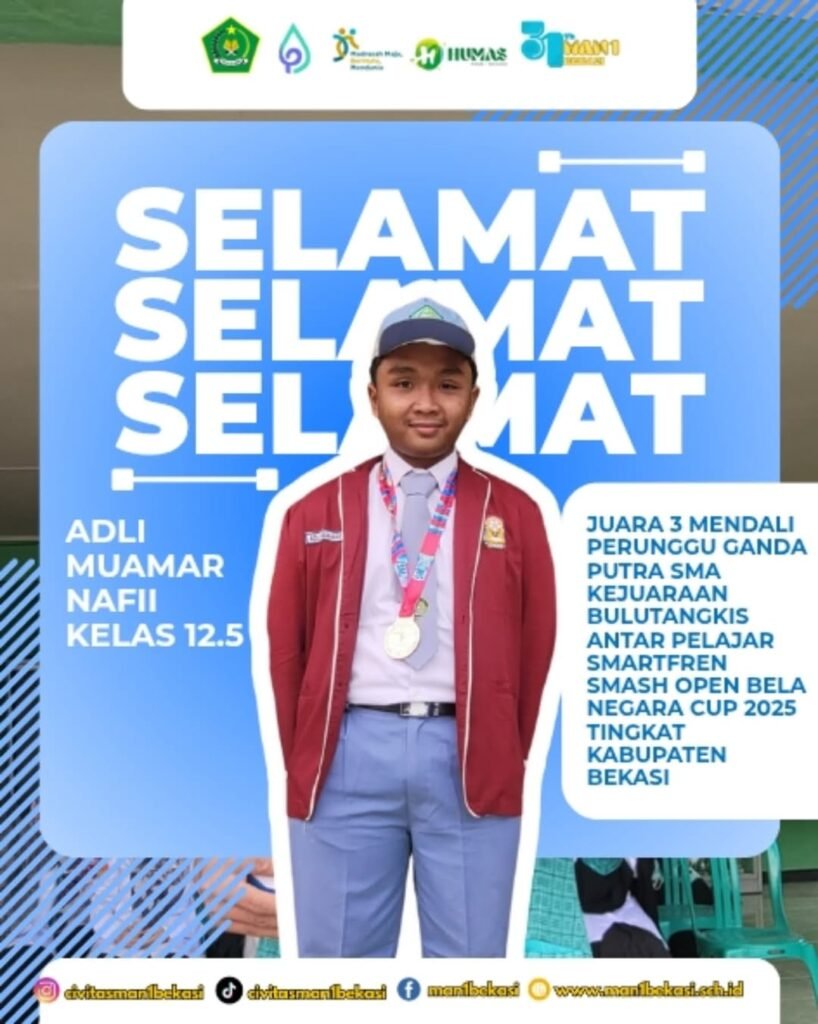 3. Adli Muamar Nafii 12.5 Juara 3 Mendali Perunggu ganda putra SMA KEJUARAAN BULUTANGKIS ANTAR PELAJAR SMARTFREN SMASH OPEN BELA NEGARA CUP 2025 TINGKAT KABUPATEN BEKASI