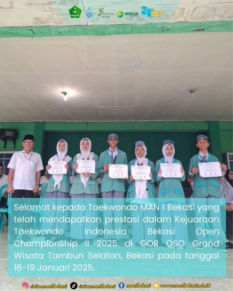 Selamat kepada Taekwondo MAN 1 Bekasi yang telah mendapatkan prestasi dalam Kejuaraan Taekwondo Indonesia Bekasi Open Championship II 2025 di GOR Grand Wisata Tambun Selatan, Bekasi pada tanggal 18-19 Januari 2025.